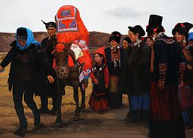她用平实的写实画法,重构现实,提炼生活,展现出彝族特有的婚俗场面,表达了彝族人的风土人情,生命力的顽强及生生不息的抗争精神。