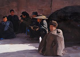 秦鲭《祈福》同样以概括性的手法将那些晒太阳的彝族老汉形象处理得简洁而深入,画面以大面积的深黑、深褐结构,有效地表达了享受阳光的彝族老汉所具有的诚恳与朴实。
