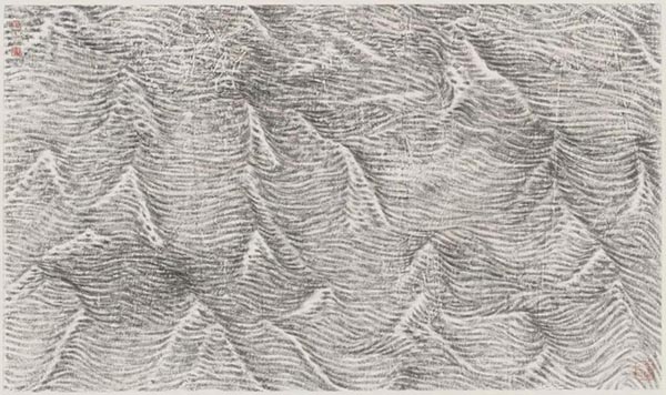 这样的看画方式,已经不同于近现代以来我们欣赏山水画的路数。唐代张彦远谈到先民由蒙昧状态而生发出书画萌芽,有言:“无以传其意,故有书;无以见其形,故有画。”这是说书法、绘画其最初问世与存在的因由。世易时移,当人类文化早就跨越了以文字表意、以图形传形的基本功能阶段,不但艺术受众已不再满足于书画作品的初级功能之后,艺术家更对书画创作、表达产生出更高一层境界的诉求,因此过往的历代越是接近于近现代,画家创作所呈现的面目越与古代范式拉开距离,作品越具有个性。尤其是当代山水画家,两千年以来铸起的山水画艺术的辉煌,林林总总各式各样的山石皴法早被玩熟画滥之后,有高度自觉追求的艺术家便会生出放下一切的决绝,而置身于通往更为超逸的精神笔墨之路上,——作为欣赏者,我们的眼光也便被拽得越来越悠长,在笔墨技法的变异之中乐得享受新的笔画样式的愉悦。