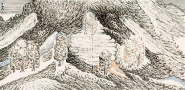 在他的诸多画作中,也可寻绎出当代画家往往视为个人独创的内容,比如可被视为独家绘画符号的,在他笔下,是山水中的一棵棵的松树。那是从他灵府中漂移出来的一个一个的饱含灵性的意象,经由笔墨而成为镶嵌并融合于山水之中的物件。乍一看到这类风格的聂氏山水,会骤感似乎与童话境界相遇。