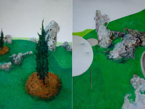 如果说张勇的《风化的石》、《夜光系列》作品是从闲时自然出发思考的话,而他的《移植的风景》、《人造景观》、《他山之石》等作品则显得更为成熟和高级。在这些作品里他更多的从概念出发,因而弱化了山、石、草木、天空的固有的特性,体现了柏拉图的认识观点:“理念”就是现实。他以询问的幻化方式,以主观认知和艺术方式把握和运用现实事物景物,将简单纯粹的情绪激动的绘画提升到了“形而上”的观念艺术绘画。更直接、更明确地表达了他对现实世界的认识和态度,简单、执着、坚韧,不为繁华所惑。