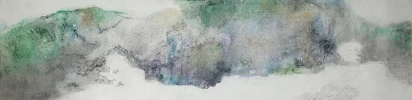 而且国涛还采取了屏风或者放大册页的连接方式,巨幅的绘画上,雅绿的轻微变化,山峦起伏的节奏,都被艺术家控制在一个微妙的内在变化上,无论色彩还是形式,似乎在一片绿镜中悄然低语,颜色的细微色觉与色感,激活生命的微知觉,这才是绘画的魅力,也是自然再次以自身的意外惊喜来临。国涛就由此形成了自己个体的形式语言,以带有书写性的线条笔触建构山石轮廓,线条跳跃,保持笔断意不断,看似某种素描,实际上是某种更为鲜活的书写。如此的大写意却并非传统的构图方式,而是在色带之间有着呼应,既灿烂又含蓄,一种不可抑制的喜悦,一种颜色之外的意味,似乎是初春时节,万物花开,山如花,花如笑,一切都在暗中涌动,还是喜悦的春色,是自然的色晕,充满了青春的喜悦之情,如此的色外色,色上色,乃是青春的形而上学,是不朽的自然诗意。