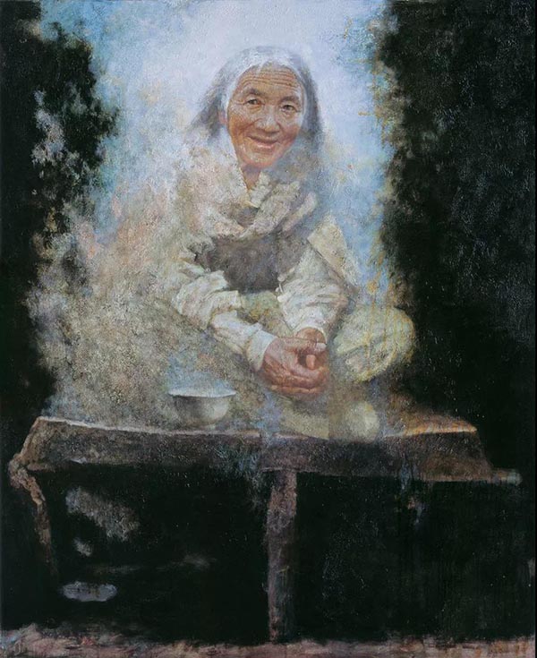 在他的油画《母与子》中,作品的构成意味具有较强的现代感。该作品并未选择常见的表现母爱的元素。在作品中,一位年轻的藏族母亲和她年幼的儿子在树林中漫步。直立的,贯穿画面上下两边的树干将画面分割成几个富有韵味的空间,母亲和儿子处于同一空间中,显然给人一种母子同处一个精神场域的暗示,引人遐想。此外,作者有意简化了对树林环境的刻画,但突出渲染了画中令人心醉的绿色调。作品中的树干和草地有着丰富微妙的肌理,画面也因此传递出令人心颤的诗意,既真切又不乏史诗感和象征意味。《母与子》超越了一般风俗画的叙事模式,成功实现了与现代人精神审美观念的对接。